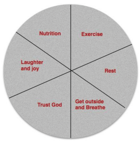 Draw a circle with six pie pieces and use the exploit labels listed in the images above. For each pie piece, estimate how successfully balanced you are. For example, if you feel you are struggling with nutrition and are probably doing 50% of what you want, draw a line that would mark 50% of the pie piece. If you are trusting God 100%, that pie piece would be fully intact. Go through each pie piece. Do you have a well balanced wheel that can make for a long, satisfying journey? Can you identify the areas that need attention?
