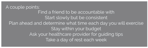 If you have decided to start walking daily and made sure there are no restrictions from your healthcare provider, next determine what time you will walk. Put your shoes on and walk! When you get home, text your friend to tell them what you just accomplished.