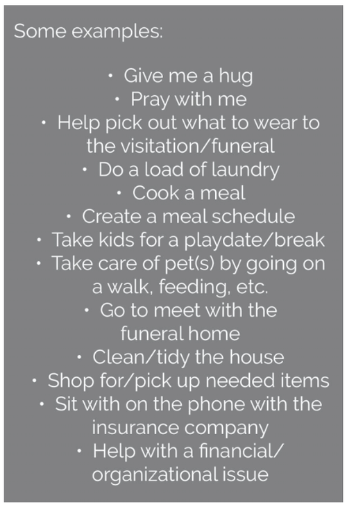 Accept help. Often, when people are grieving, friends and relatives will say, “Let me know how I can help.†But if you are feeling overwhelmed with grief, it’s hard to know how to respond. Below is a list you can show to someone who has offered to help.