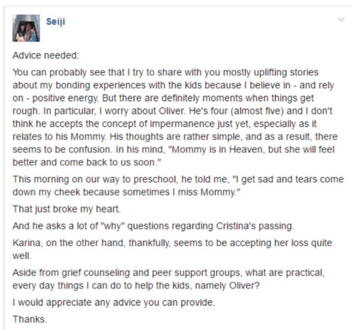 It’s the responsibility of close family and friends to listen and be present. Often times, loved ones do not know what to do for the diagnosed family, so they do nothing. It’s too common that families affected by terminal illness feel isolated. Family and friends, please resist the potential awkwardness and sadness. Don’t stay away. Be present and listen often.